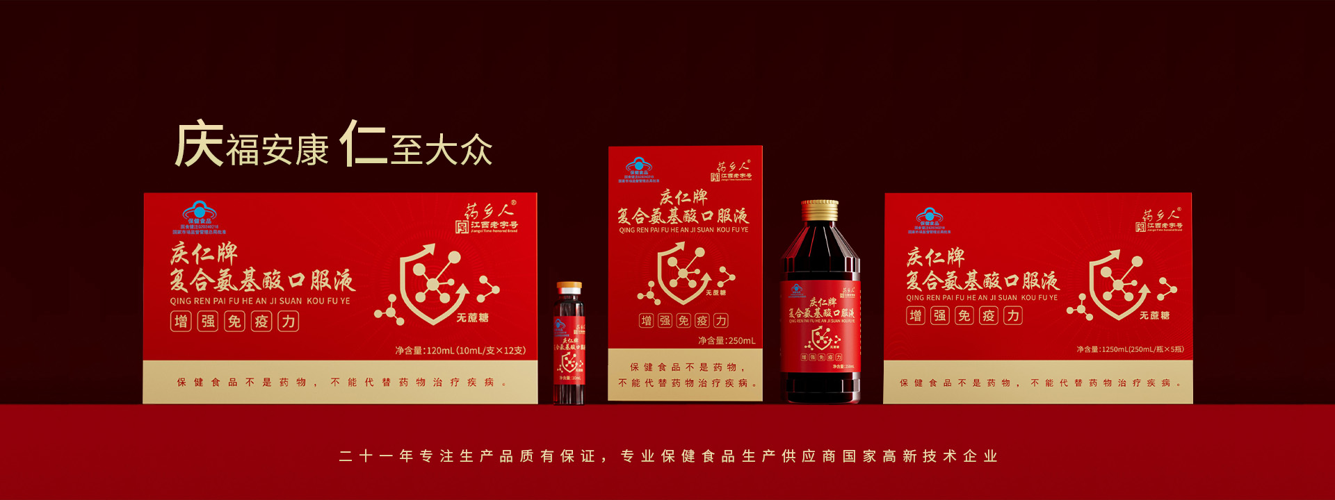 江西樟樹市慶仁保健品有限公司成立于2004年1月18號,注冊資金2600萬元,是一家專業致力于保健食品和營養食品研發、生產、銷售為一體的現代企業。公司現有保健品批文:藥鄉人牌黃芪當歸阿膠口服液。慶仁牌蛋白質粉,慶仁牌鈣鐵氨基酸口服液、慶仁牌牦牛骨茯苓山藥核桃維D顆粒、阿膠枸杞顆粒、復合氨基酸、西洋參淫羊霍酒、慶仁牌鹿茸人參酒、慶仁牌鈣維生素D咀嚼片、慶仁牌葡萄糖酸鋅口服液、葡萄糖鈣口服液、硒口服液,硒片等自有批文二十二個,正在申報的保健品批文十六個,同時擁有普通食品生產線、固體飲料其他飲料、配置酒、壓片糖、消殺劑生產線。我們的專業品質保證...